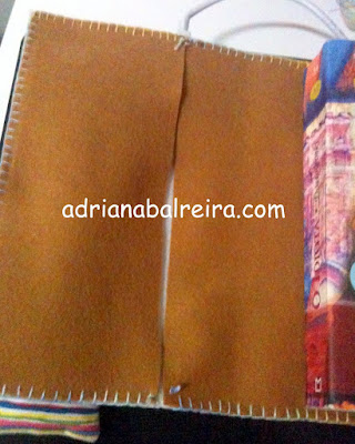 Ah, e no final como a capa tinha ficado um tanto sem graça, branca, sem nada. Fiz um coração de tecido e preguei com ponto alinhavo. Estou cansando de coração. É a única coisa que sei cortar sem molde. Tenho que arranjar outras coisas. Eu queria bordar o nome: O IDIOTA, mas testei em um pedaço de feltro e ficou "pôdi". Tenho que treinar muito para ficar "marromeno".